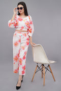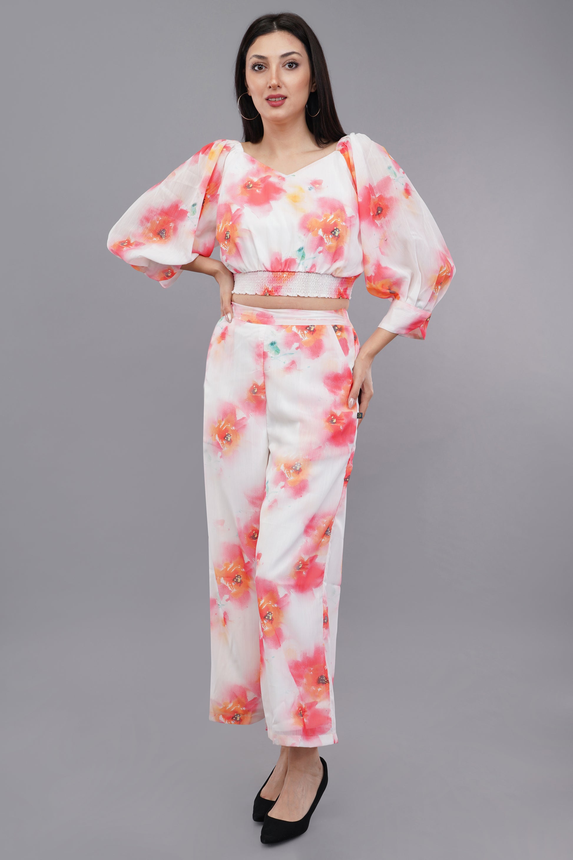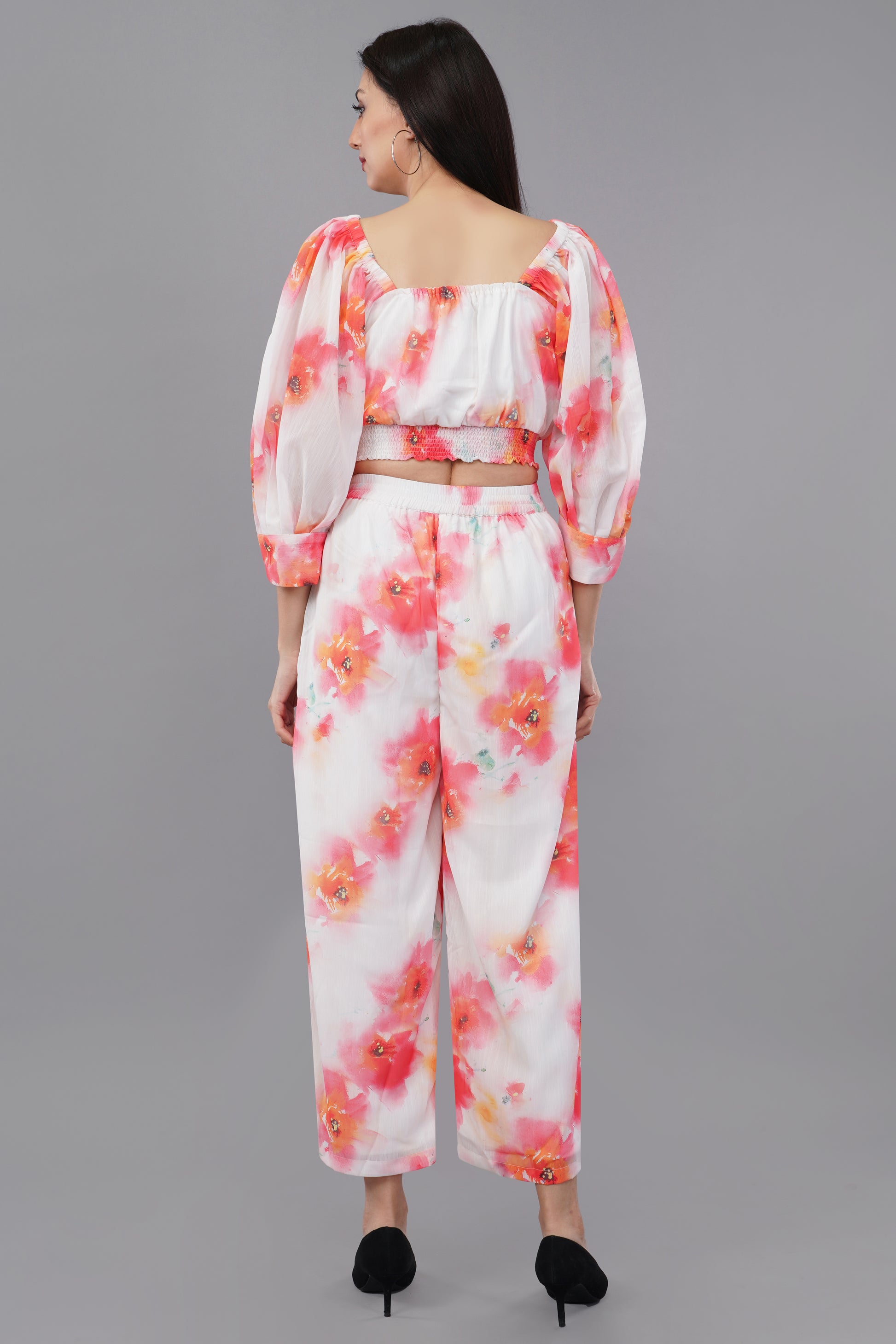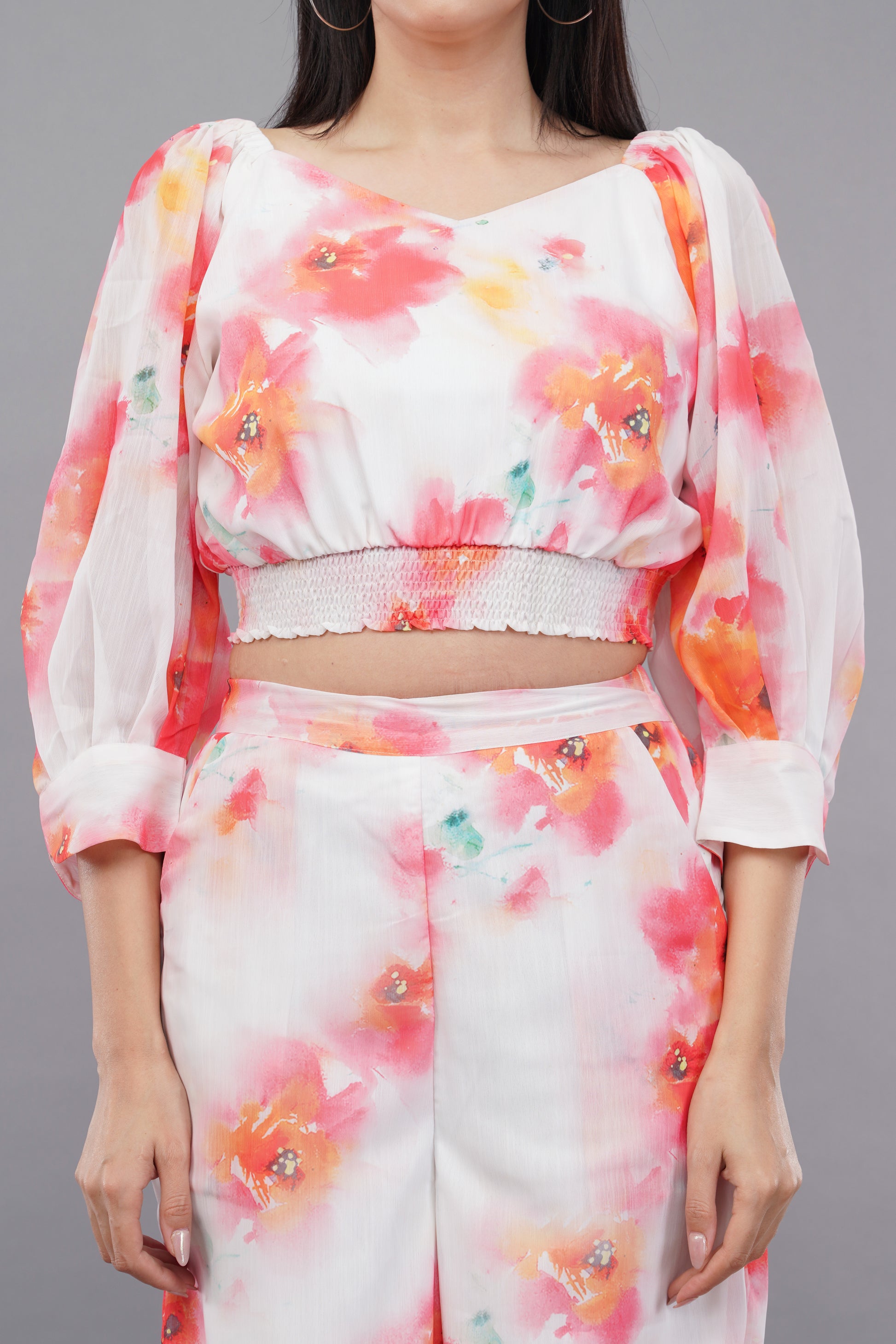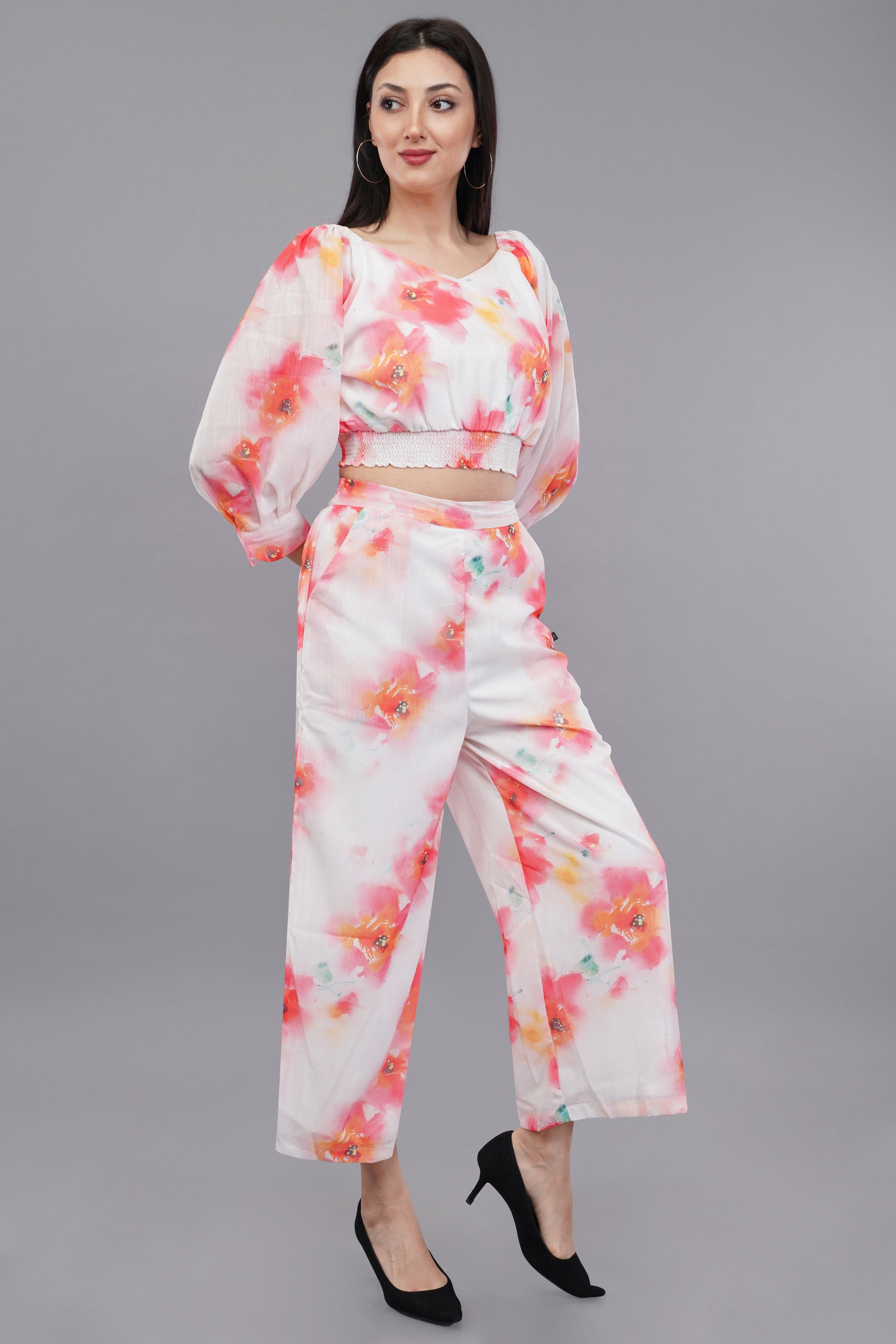 White Floral Print Plazzo Cropped Top Co-ords Set